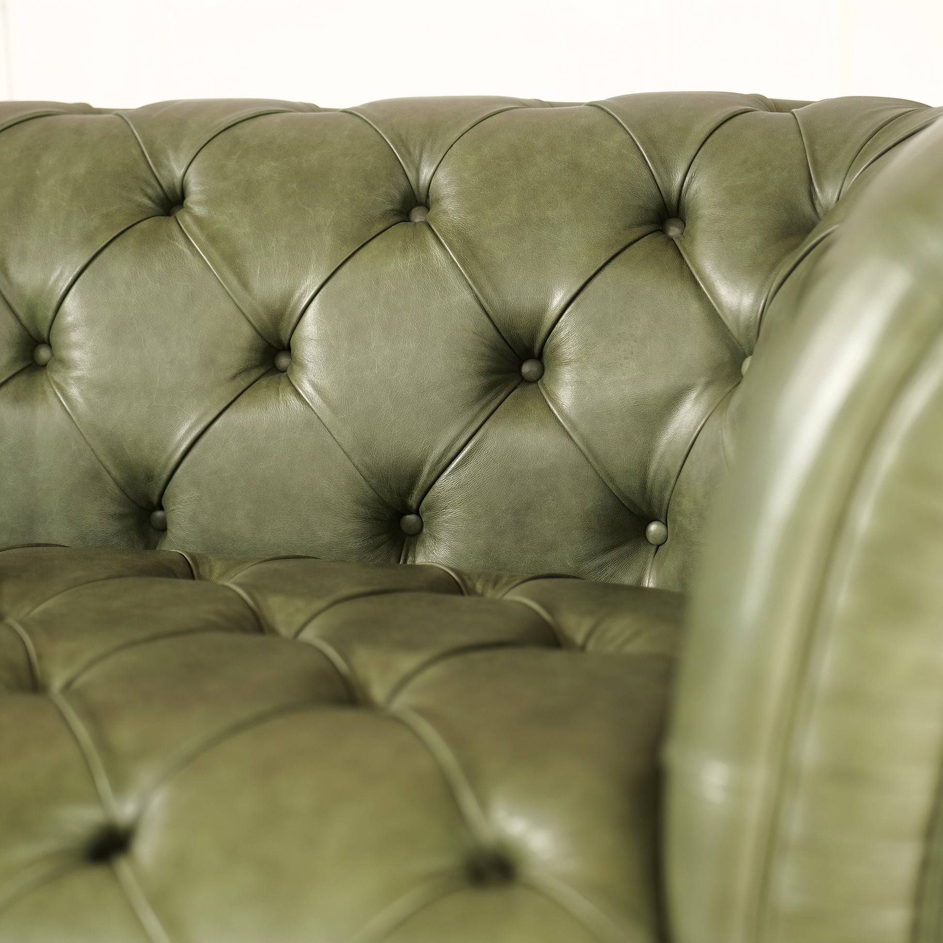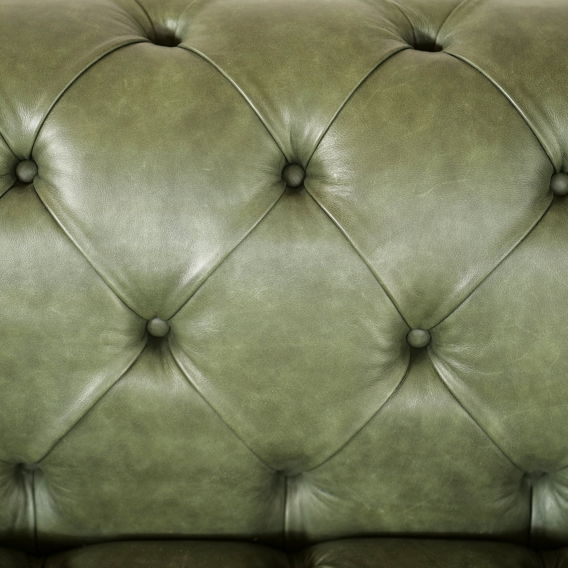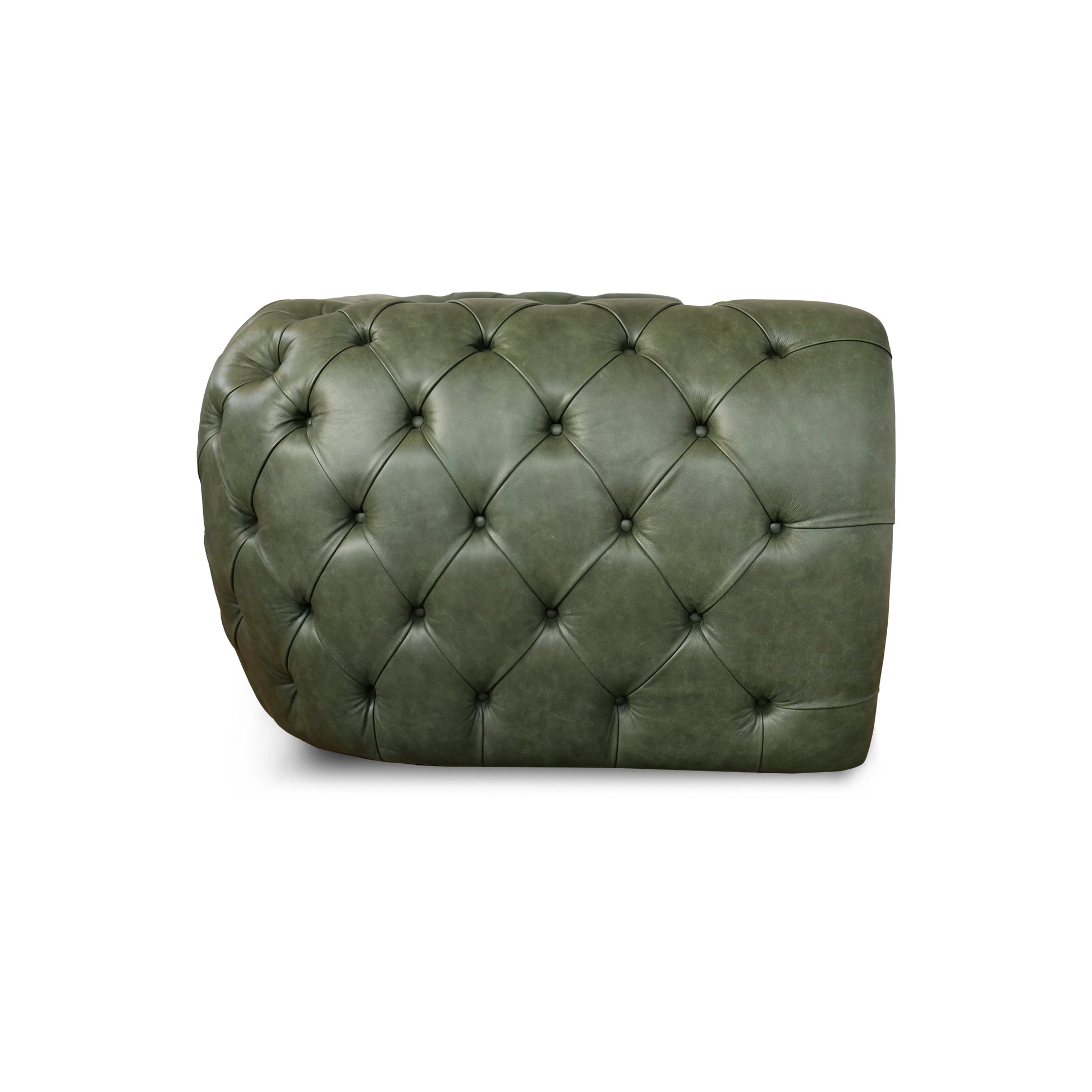 La pelle verde inglese racconta il tempo con eleganza, cattura la luce in modo discreto, restituisce calore. Ogni capitonné è un invito a fermarsi, a rallentare, a concedersi uno spazio di quiete autentica. Le forme generose e classiche dialogano con l’anima contemporanea, creando un equilibrio naturale tra memoria e desiderio.