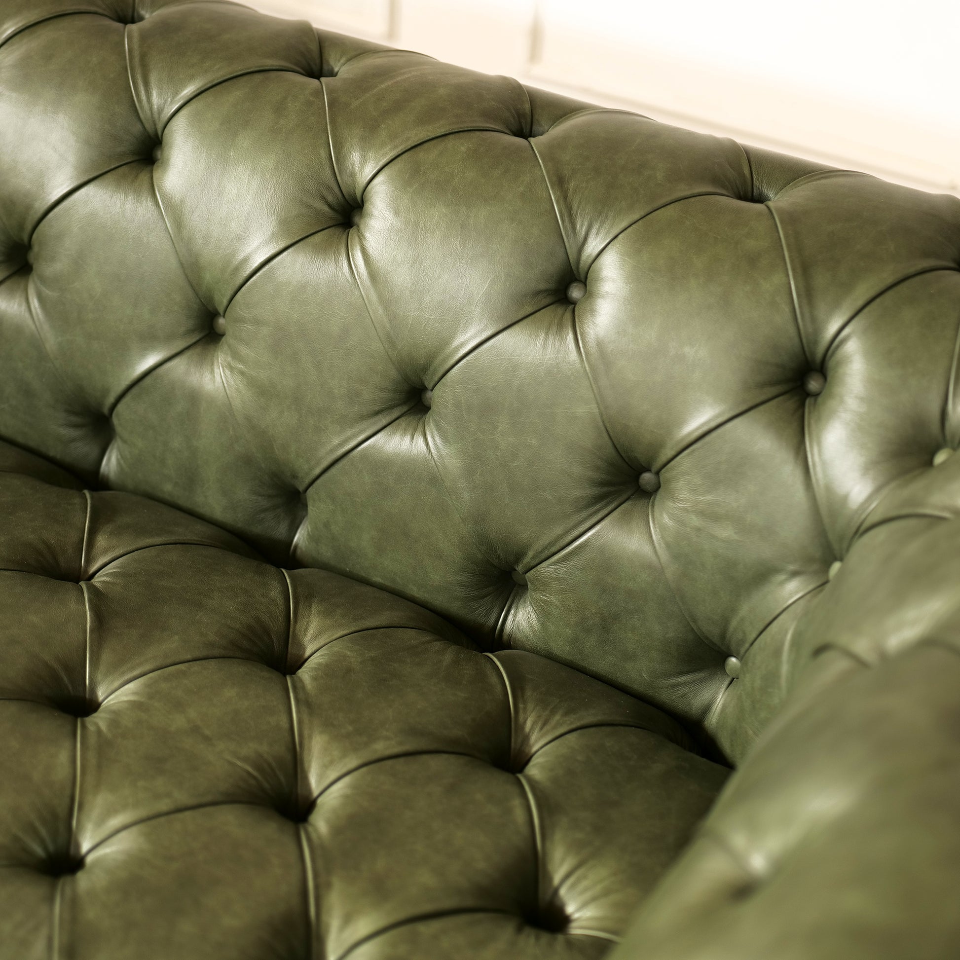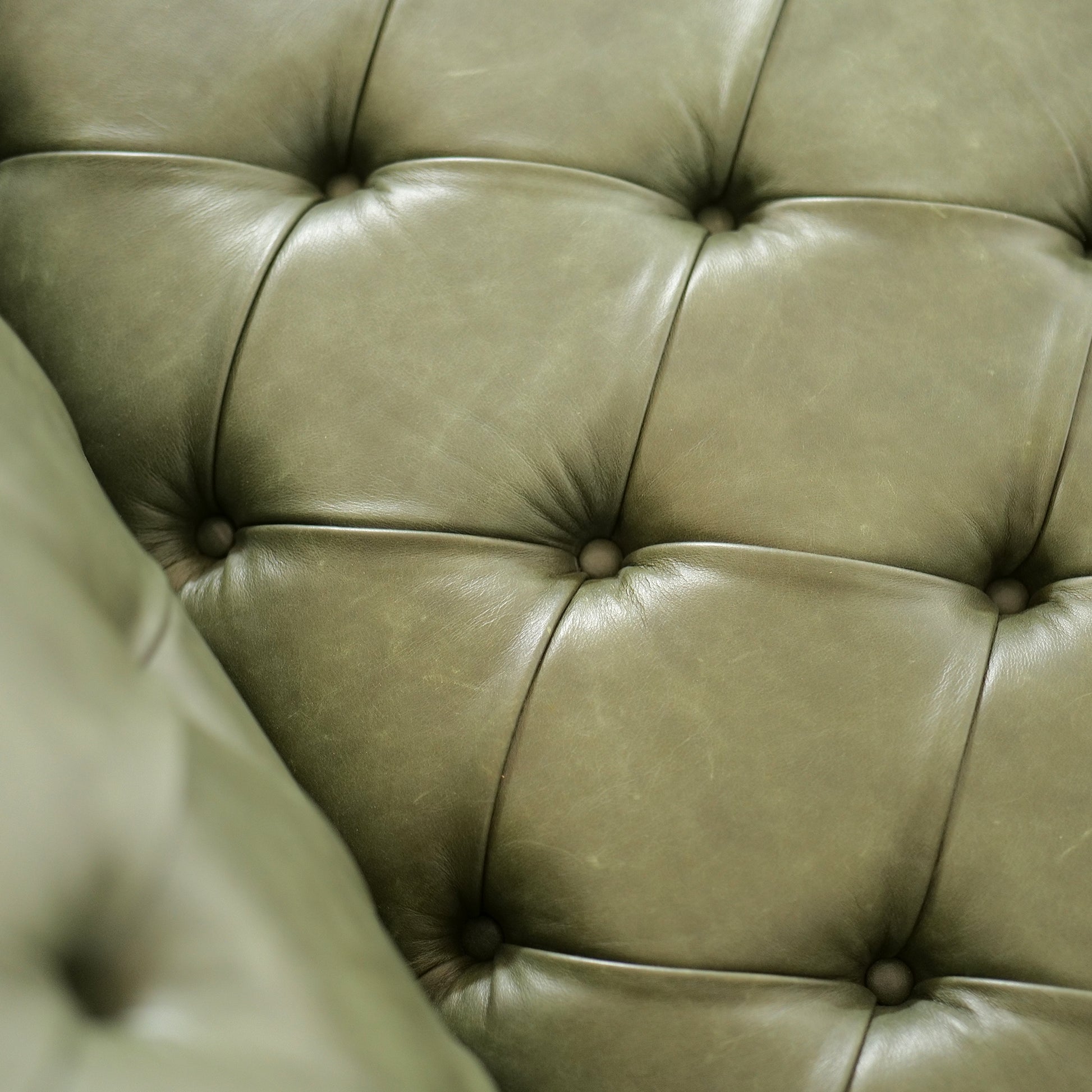 Il rivestimento in pelle di alta qualità è caratterizzato da una finitura naturale che valorizza le sfumature e la texture del materiale. La lavorazione capitonné dello schienale e dei braccioli, richiama la tradizione artigianale dei grandi divani classici.