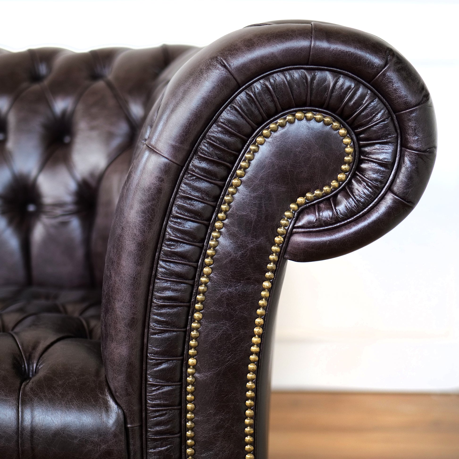 I braccioli arrotolati, perfettamente allineati con lo schienale, definiscono l’estetica iconica del Chesterfield, mentre la bordatura con borchie decorative color ottone sottolinea con eleganza il profilo del divano.