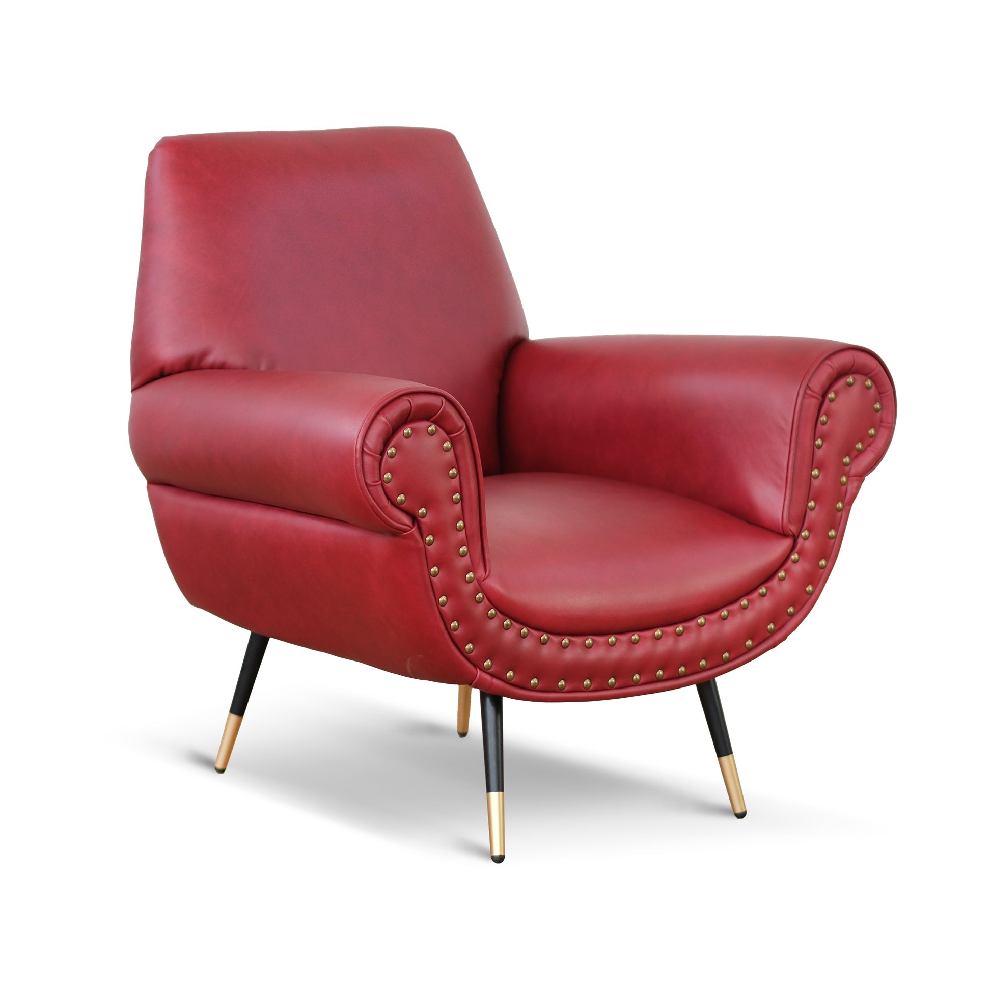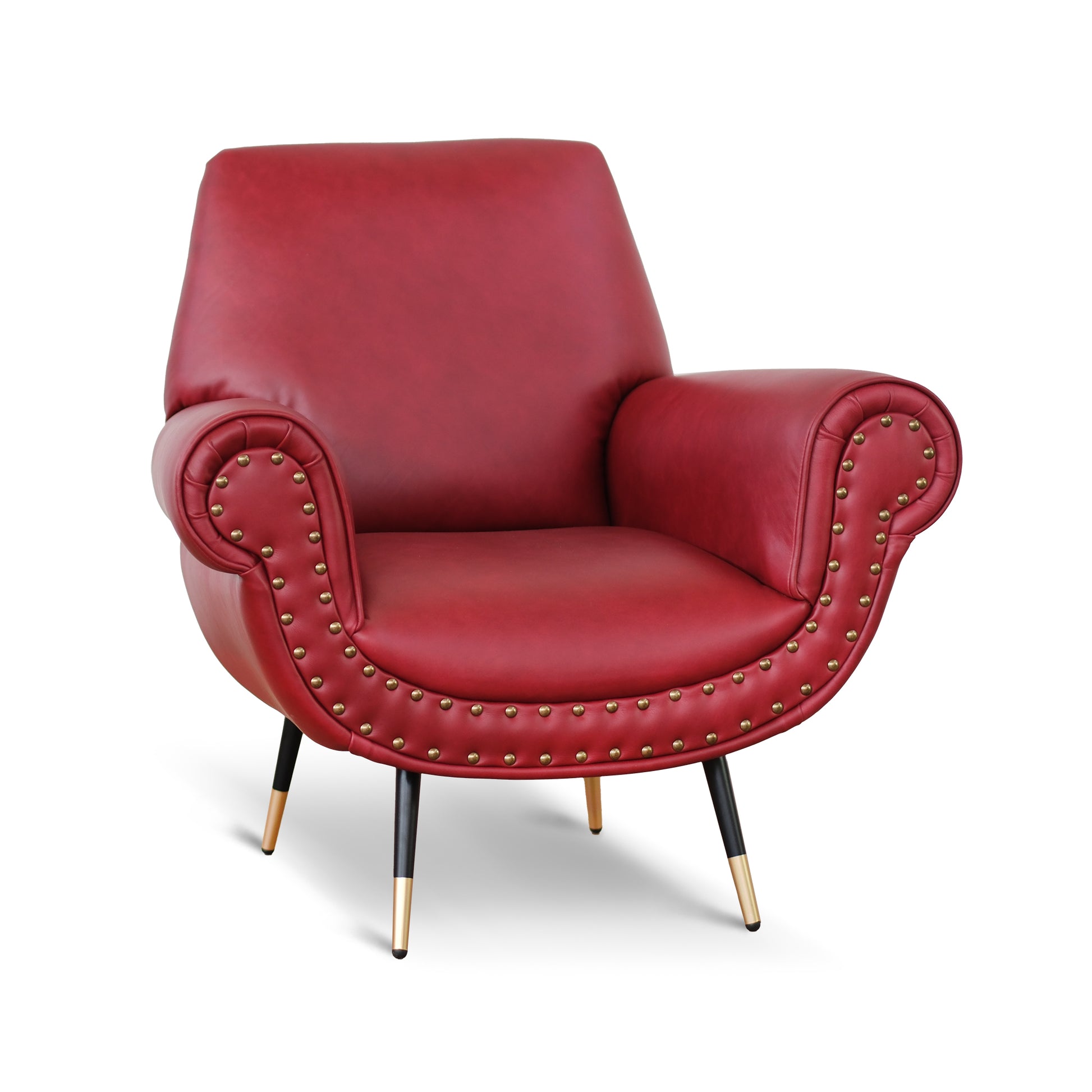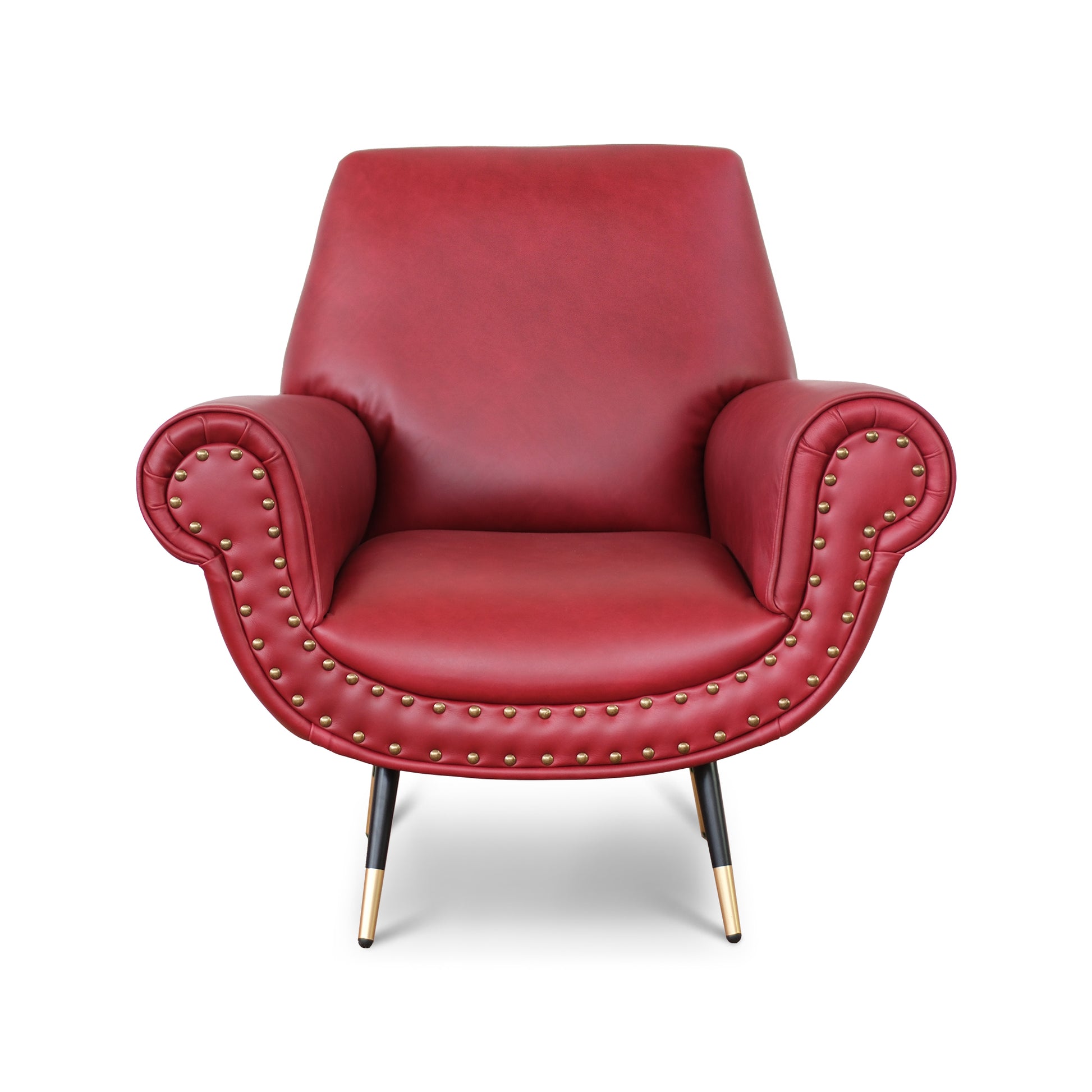 Fauteuil design vintage Vico en cuir grainé pull up rouge cerise avec clous vieillis et pieds noirs et laiton