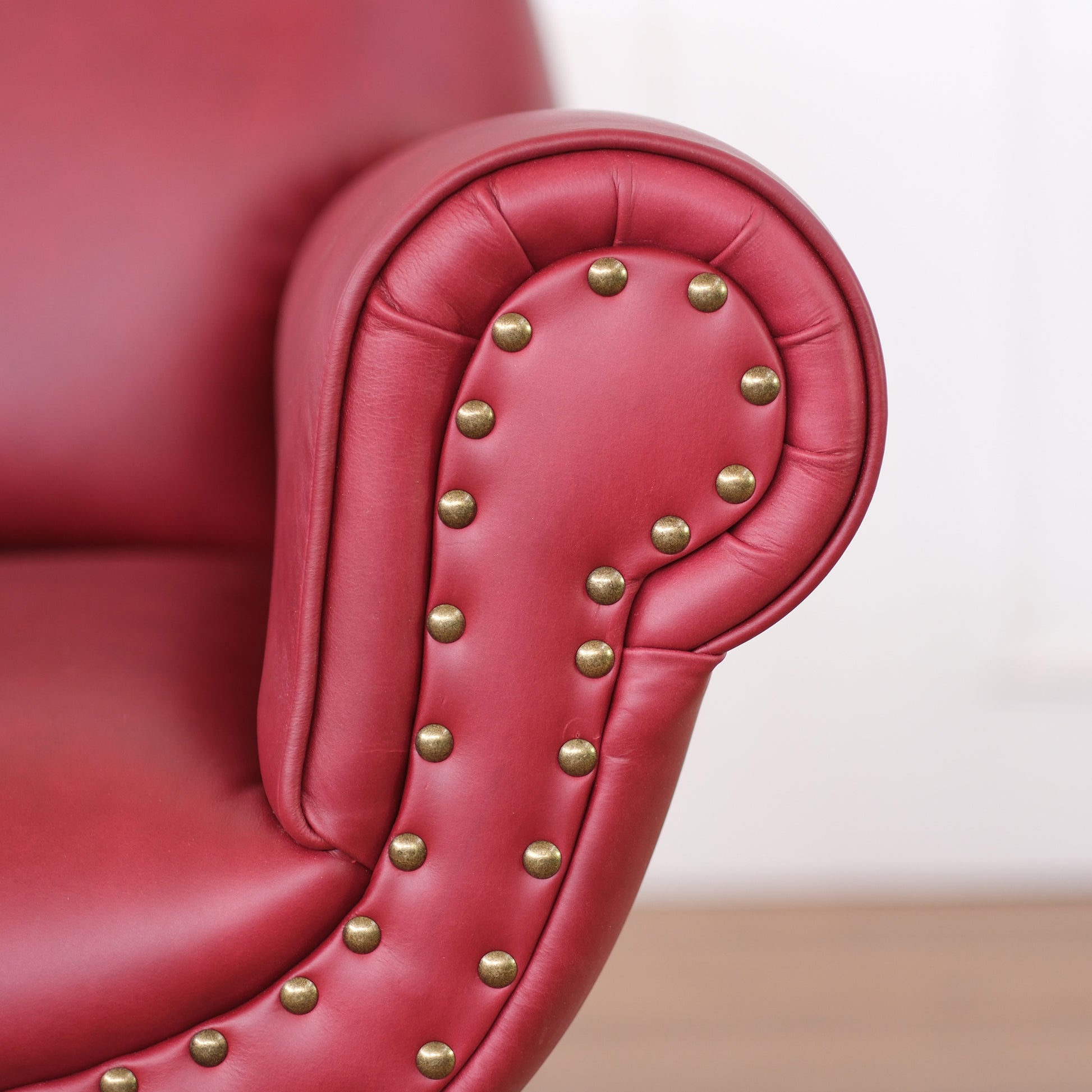 Sellerie cuir pleine fleur pull up rouge cerise avec clous sur les accoudoirs et sur le dossier.